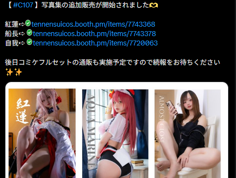 ゲーム 豪華な写真集3作品を一挙販売! 天然水、コミケ107での人気作品を追加販売開始 2026-01-28 antyobi 情報フェスティバル コスプレイヤーの天然水さんが1月4日、コミケット107で好評だった写真集3作品の追加販売をXで発表しました。 Xのエラーにより埋め込 …