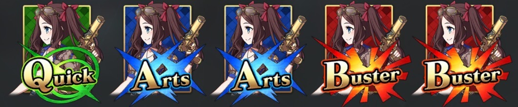 | ●味方単体のQuickカード性能をアップ[Lv](3T) ●Artsカード性能をアップ[Lv](3T) ●Busterカード性能をアップ[Lv](3T) |
