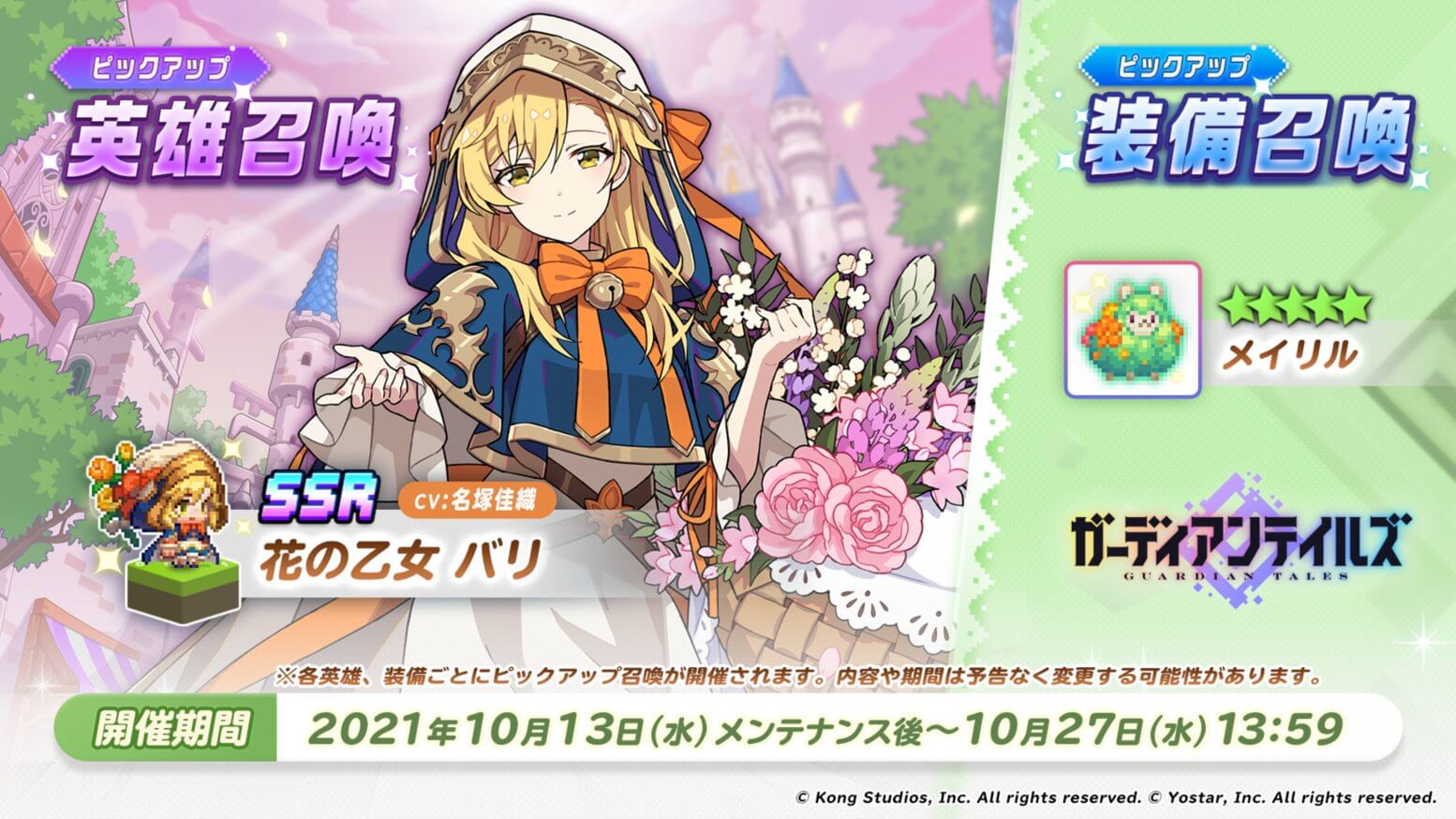 Kong Studiosが開発と配信、Yostarとともに送るスマートフォン向けドット絵アクションRPG『ガーディアンテイルズ』にて、本日2021年10月13日(水)にメンテナンスが実施、その後に新キャラクターがピックアップされます。
