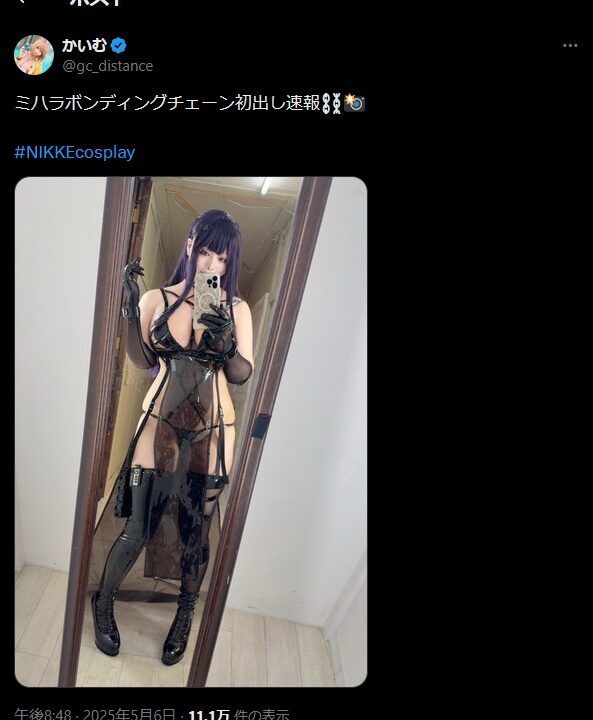コスプレイヤーのかいむさんが5月6日、スマートフォンゲーム『勝利の女神:NIKKE』のキャラクター「ミハラ」の、ボンディングチェーン衣装を着用した自撮り写真をXで投稿しました。