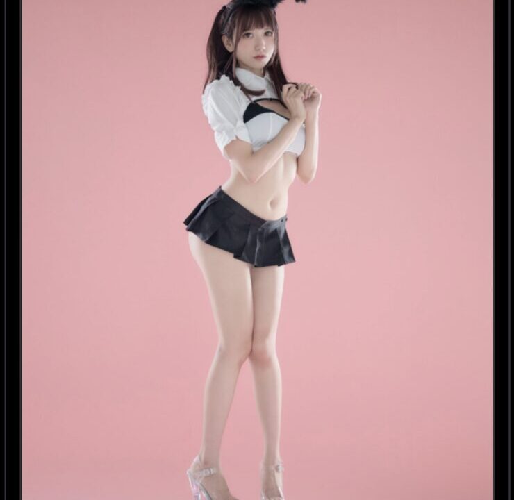 くろうさぎさんが着用しているのは、黒いミニスカートと白いビスチェトップスのバニーガール衣装。超ミニ丈のスカートからは美しいヒップから太もものラインが見えており、セクシーなデザインです。