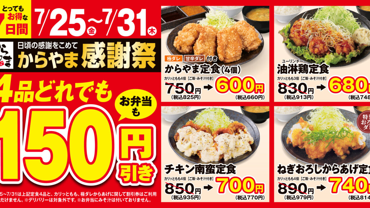 今回の感謝祭では、定食で一番人気の「からやま定食(4個)」をはじめ、人気の定食4品がどれでも150円引きとなります。同社によると、夏本番も頑張る皆さまへ日頃の感謝をこめて実施するとのことです。