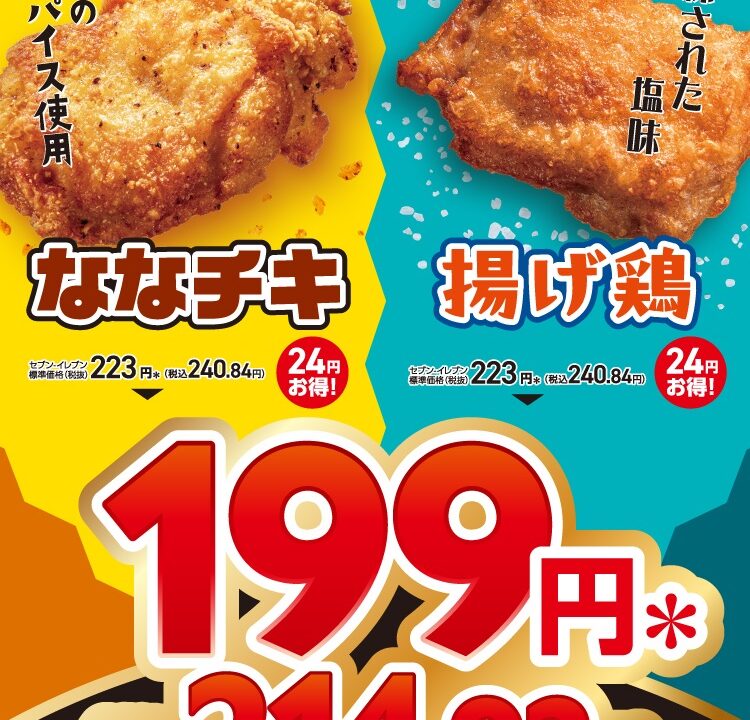 コンビニエンスストアチェーン『セブン‐イレブン』は7月28日、全国のセブン‐イレブン店舗で人気のフライドチキン『ななチキ』と『揚げ鶏』を特別価格199円(税込214.92円)で販売するキャンペーンを8月1日から実施すると発表しました。