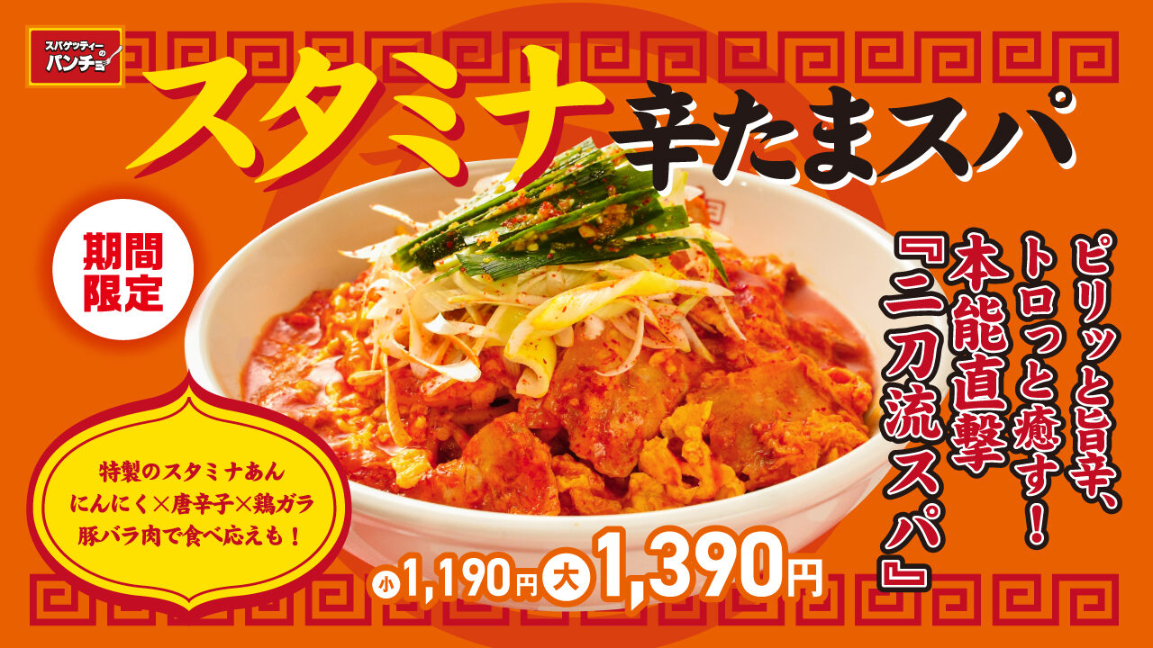 ナポリタン専門のスパゲッティ専門店「スパゲッティーのパンチョ」は8月8日、同店において期間限定メニュー『スタミナ辛たまスパ』を8月16日に発売すると発表しました。記録的な暑さが続く今夏の体力サポートを目的とした、あんかけ風スタイルのスパゲッティーとのことです。