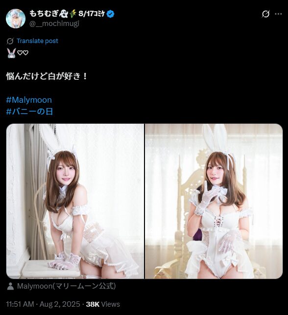 この投稿には「♡♡ 悩んだけど白が好き! #Malymoon #バニーの日」というコメントが添えられており、白い衣装への愛着が伝わってきます。