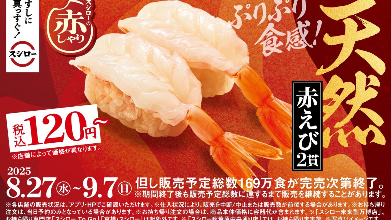 目玉商品として「天然赤えび2貫」が税込120円~で登場します。ぷりぷりの食感と甘み、ふり塩で旨みを引き出された赤えびを楽しめます。販売予定総数は169万食となっています。