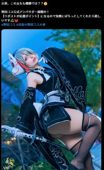 野田コス公式アンバサダーに挑戦中のむうにゃさん。和装2Bという独創的なアレンジで、ファンからの熱い応援が続いています。