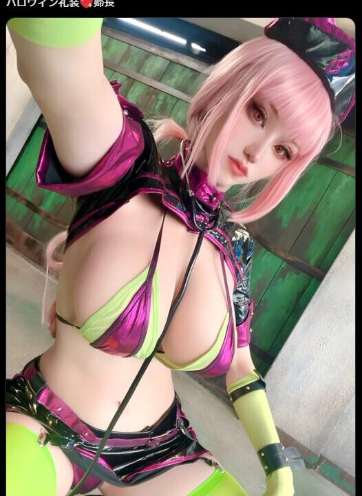 ましょこさんが着用しているのは、ナイチンゲールのハロウィン礼装バージョンの衣装。メタリックなピンクとライムグリーンの鮮やかな配色が目を引くビキニスタイルのコスチュームです。