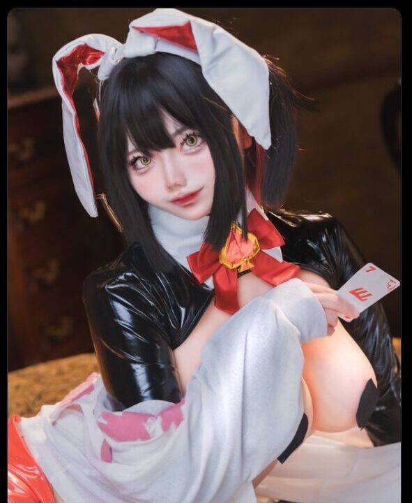 猫目さゆさんが着用しているのは、ルージュのカジノディーラー風バニーガール衣装を忠実に再現したコスチューム。黒いエナメル素材のボディスーツに白い上着を羽織り、頭には白と赤のバニー耳カチューシャを装着しています。