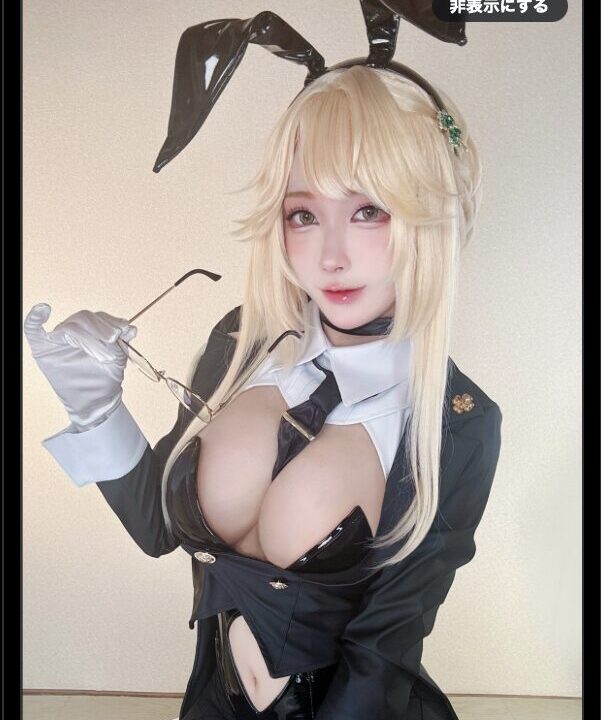 プラチナブロンドのロングヘアに黒のバニー耳を装着し、エードのバニースタイルを完璧に再現。メガネを手に持ったポーズが知的さを感じさせ、大人の魅力にあふれています。