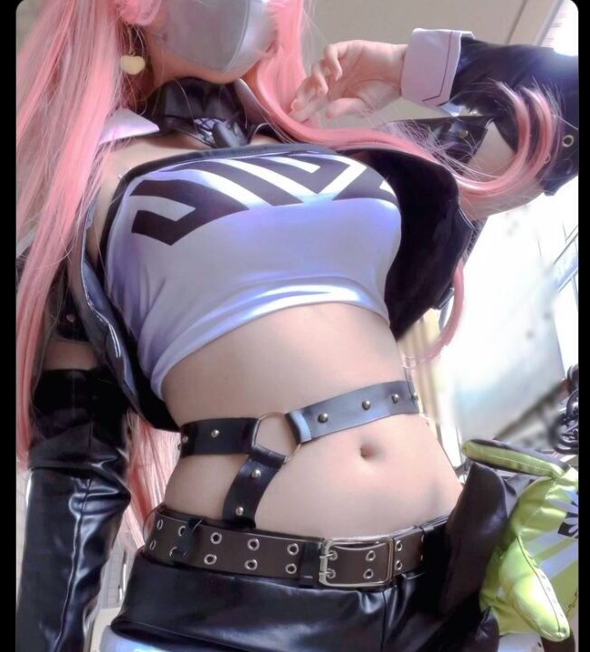 トマさんが着用しているのは、ニコデマラの衣装を忠実に再現したコスチューム。白と黒を基調とした露出度の高いデザインで、黒のレザーベルトがウエストや太ももを強調しています。