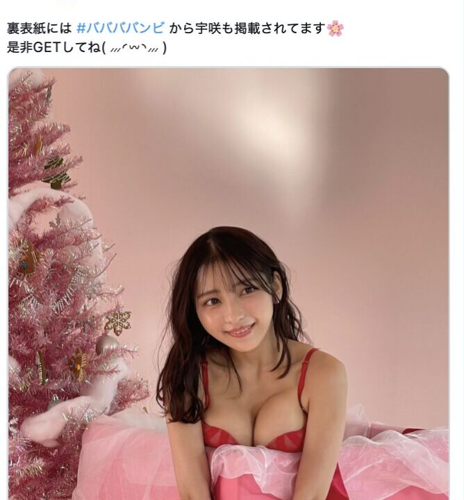 背景には同じくピンク色のクリスマスツリーが飾られ、クリスマスムード満点。全体がピンクで統一されたガーリーな世界観が、十味さんの魅力を引き立てています。