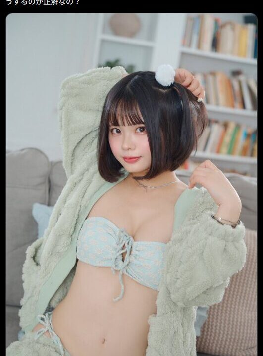 黒髪のボブカットに白いシュシュをつけたヘアスタイルも、清楚で可愛い雰囲気を演出。本棚のある明るい部屋で撮影された写真は、まるで彼女のプライベートな一面を覗いているような親近感を感じさせます。